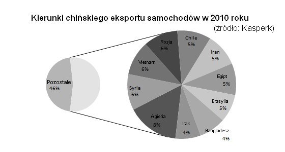 Co ciekawe, głównymi kierunkami eksportu nie są rynki państw sąsiednich, z wyjątkiem Wietnamu. Ponad polowa topowej dziesiątki odbiorców to kraje Bliskiego Wschodu. Kraje o niskich lub średnich dochodach według klasyfikacji Banku Światowego. Kraje te potrzebują pojazdów w konkurencyjnych cenach (średnia cena chińskiego wyeksportowanego samochodu osobowego wyniosła 4.760 euro) i maja niższe wymagania co do jakości i bezpieczeństwa niż kraje zachodnie.